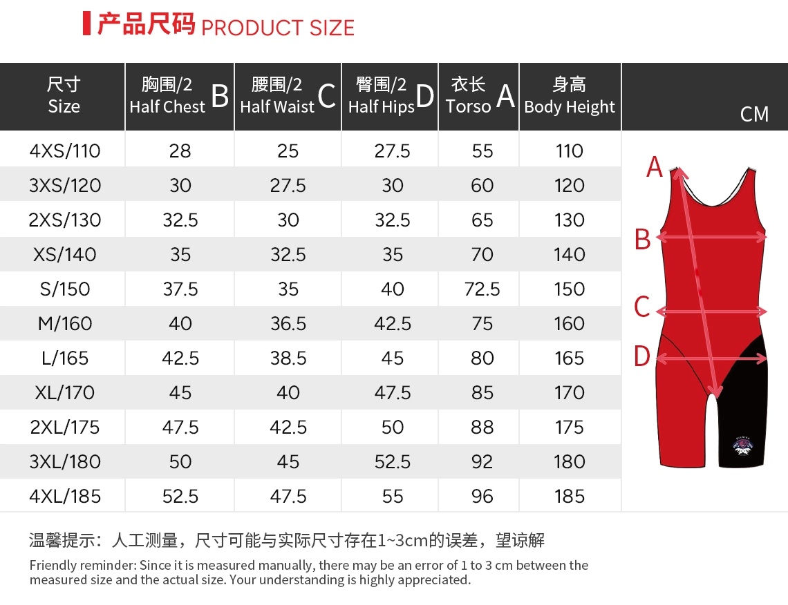 | 尺码 | 4XS/110 or 3XS/120 or 2XS/130 or XS/140 or S/150 or M/160 or L/165 or XL/170 or 2XL/175 or 3XL/180 or 4XL/185 |